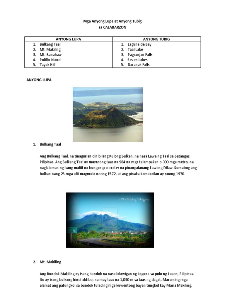 Larawan ng Anyong Tubig at Lupa na makikita sa Rehiyon IV-A Calabarzon Cavite Laguna Batangas Rizal Quezon Anyong lupa bulkang taal San Nicolas Batangas Mtmakiling Sto. Tanyag na Anyong Lupa na Matatagpuan sa Asya.