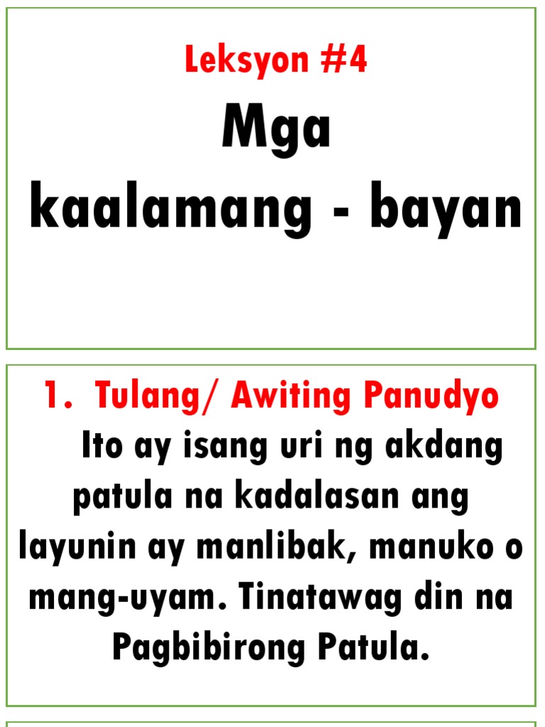 Ito ay isang pahulaan sa pamamagitan ng paglalarawan. Pumili sa sumusunod na Kaalamang-Bayanbugtong tugmang de-gulong at palaisipan. Start studying Ibat-ibang Uri ng Kaalamang Bayan Mga Uri ng Awiting-Bayan.