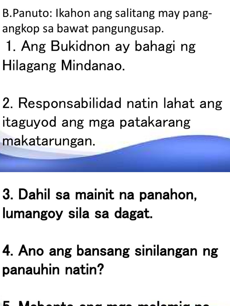Bumuo ng pangungusap na nagpapahayag ng iyong sariling ideya tungkol sa bawat larawan. Inuulit binubuo ng salitang inuulit. The correct answer was given.